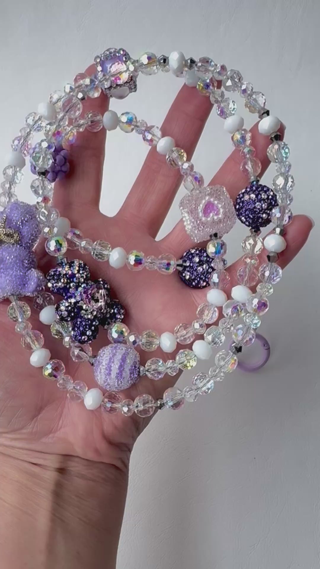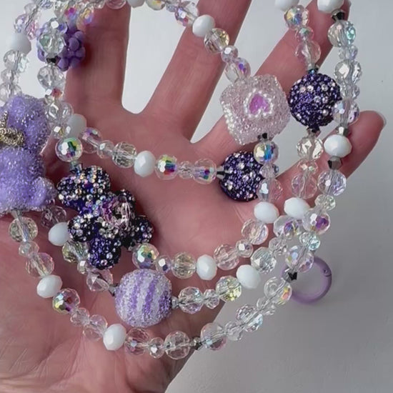 Add a touch of playful elegance to your everyday tech accessories with our handmade beaded phone charm strap. Featuring a whimsical mix of iridescent beads, glittering purple accents, and unique focal pieces like a textured teddy bear, sparkly hearts, and shimmering baubles, this charm combines kawaii style with functional flair. Perfect for securing your phone, ID, or keys with style, this phone strap is a must-have for fans of cute accessories and aesthetic details.