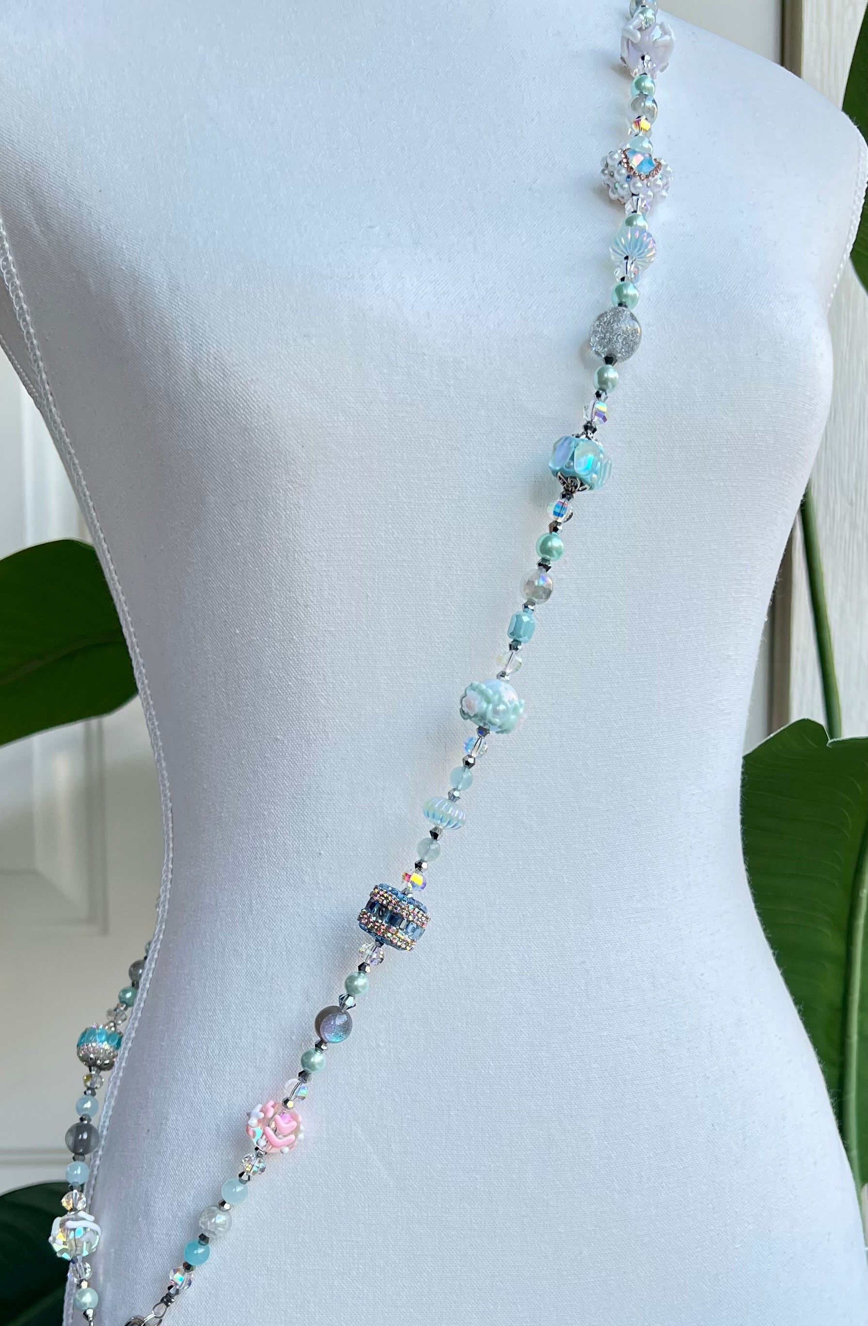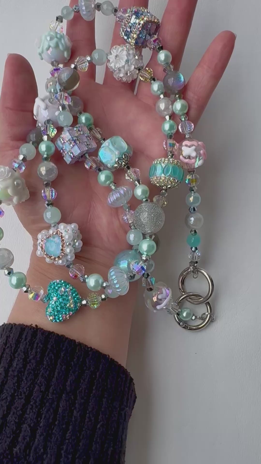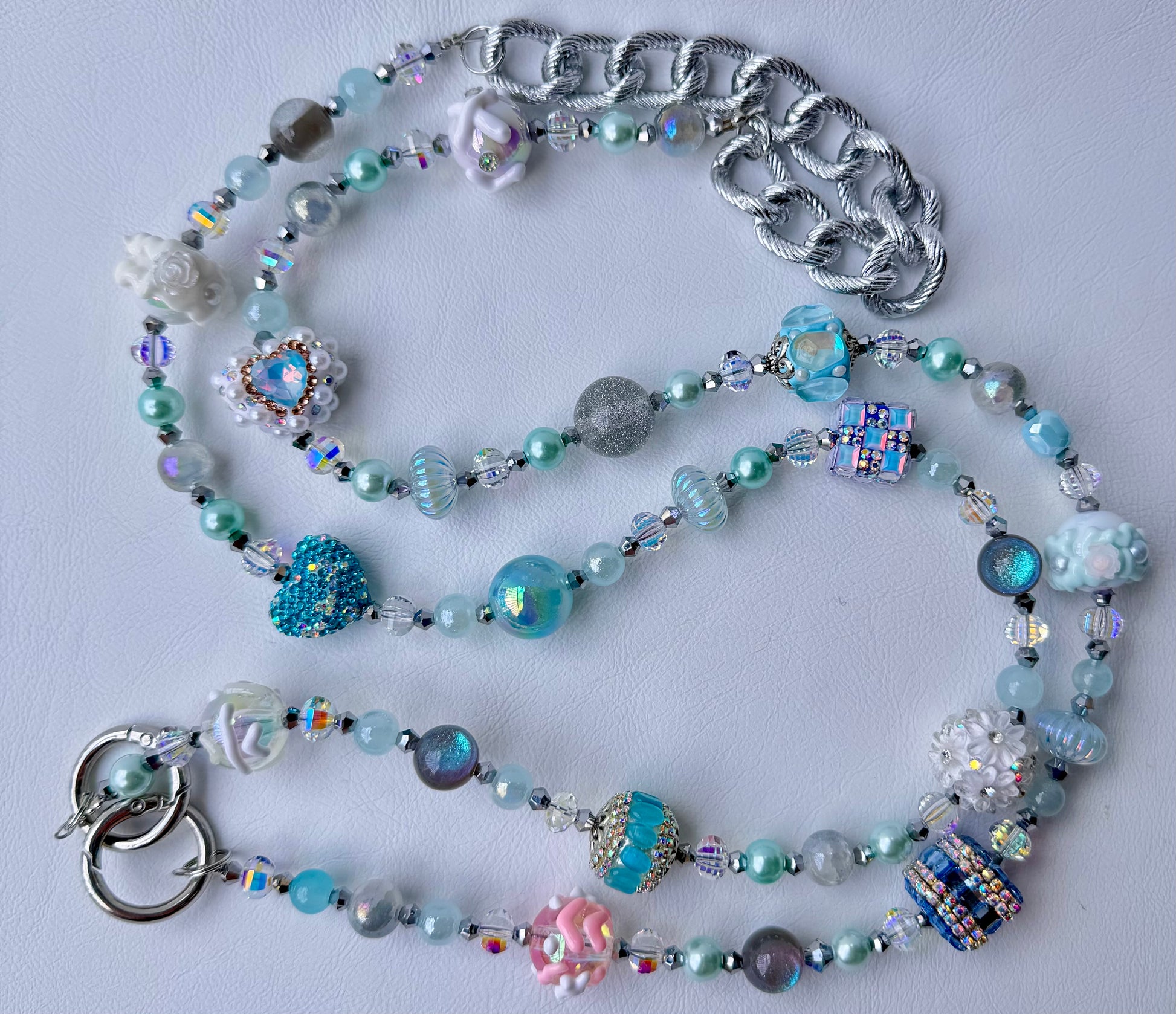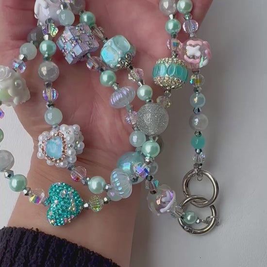 Add a dreamy touch to your everyday carry with this handmade ice blue and pastel phone strap. This one-of-a-kind piece features a stunning array of ocean-inspired and fantasy-themed beads — from shimmery aqua orbs and textured floral charms to glittering cube beads, holographic accents, and heart details. Balanced with elegant silver hardware and a chunky metallic chain, it offers both beauty and durability.