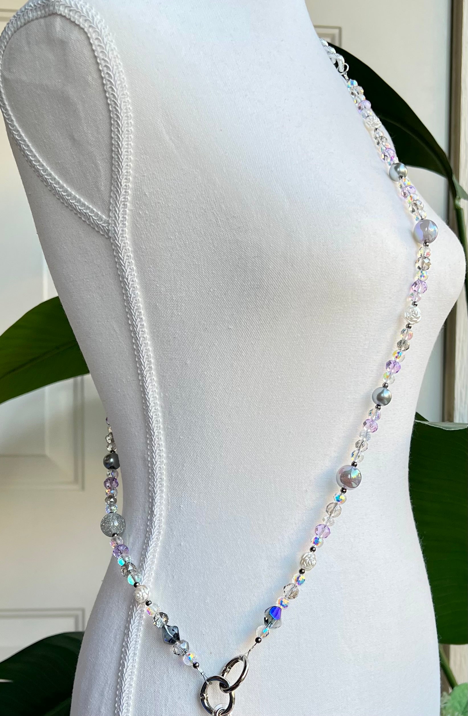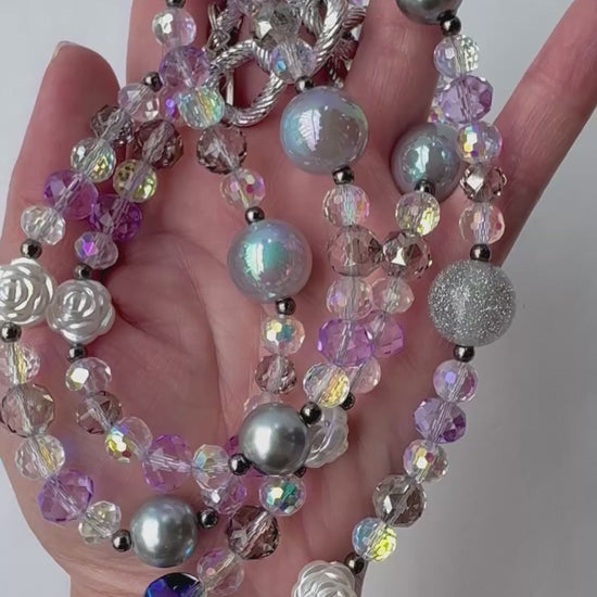 Lavender, gray, and silver tone beads with floral and pearl accents