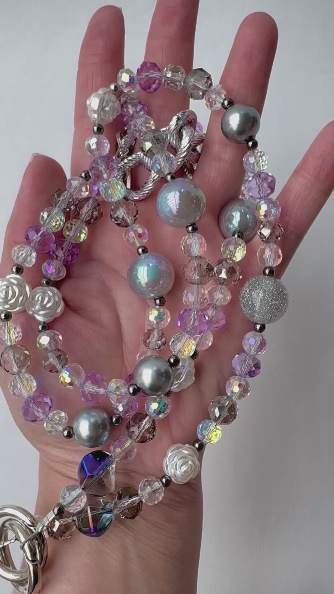 A dreamy blend of lavender and silver, this handcrafted beaded phone strap is both functional and elegant. Featuring frosted rose beads, iridescent crystals, and sustainable upcycled elements, it's the perfect accessory for everyday glamour. No duplicates – each strap is a unique creation