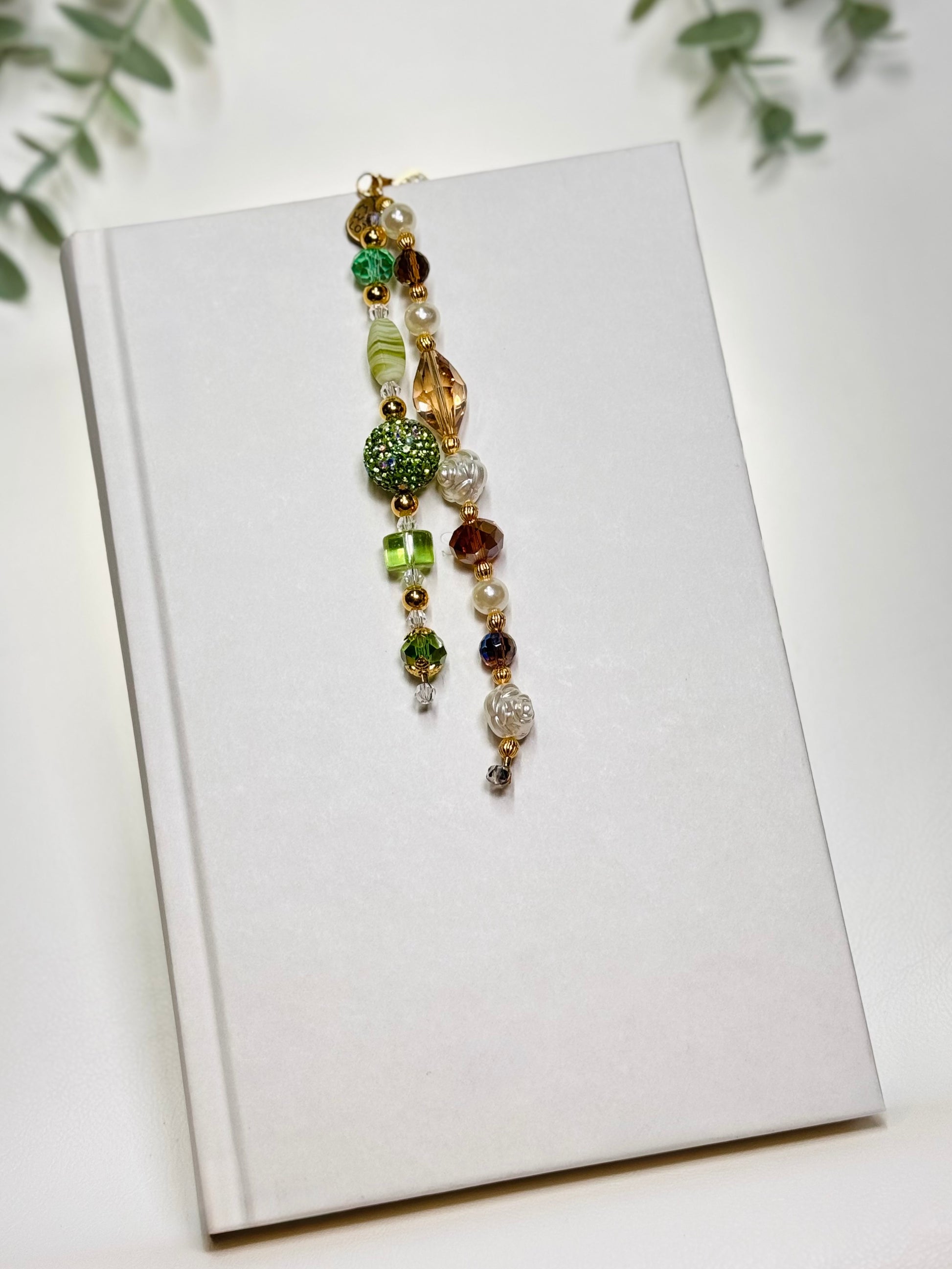 Decorated with handpicked crystals, pearls, and floral-inspired beads in earthy greens and golds