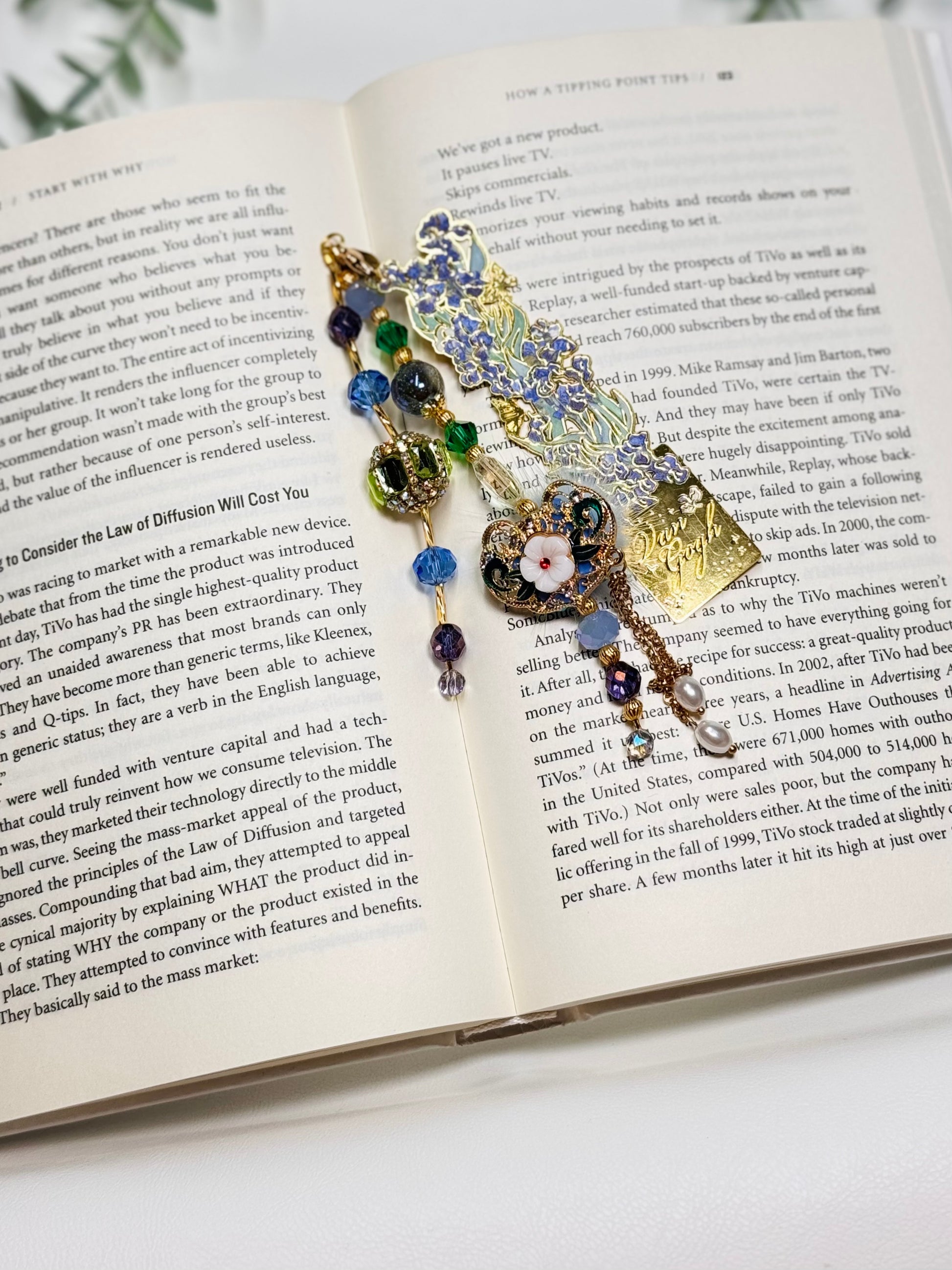 Handmade bookmark featuring a gold-edged cut-out design inspired by Van Gogh’s “Irises” painting