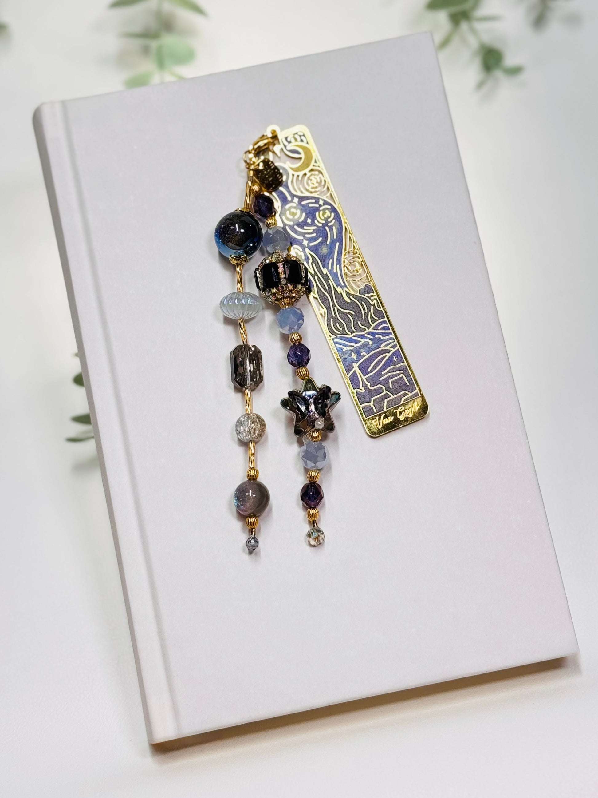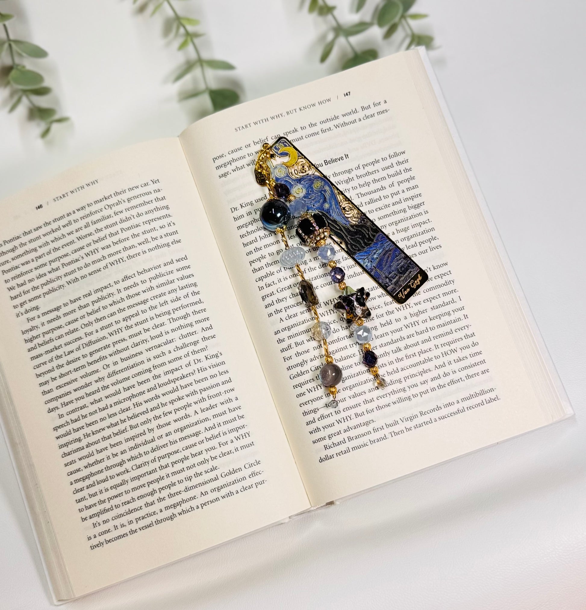 Handmade rectangular Van Gogh bookmark inspired by “The Starry Night” with detailed gold accents